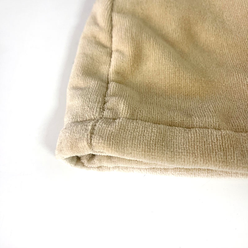 ループ状に織り込まれたパイルを平らにカットした生地。なめらかで光沢感があります。内側は吸水性の良いパイル生地