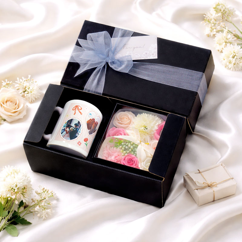ソープフラワーボックスと名入れオリジナルマグカップをギフトボックス×リボンで贈れるギフトセットです。