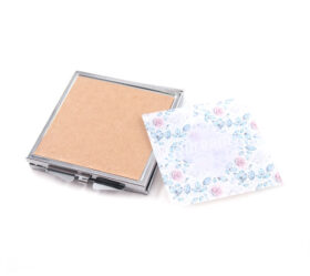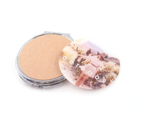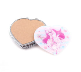 金属製の折りたたみタイプのミラー。鏡は見開き仕様で、片面が等倍、もう片面が拡大鏡になっているため、メイクや身だしなみを整えるのに便利なアイテムです。フタの落とし面(凹み部分)にオリジナルプリントしたアクリルプレートを貼り付けます。